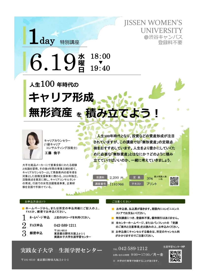実践女子大学生涯学習センター1Day特別講座「人生100年時代のキャリア形成 無形資産を積み立てよう」
